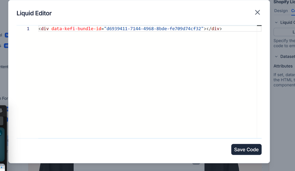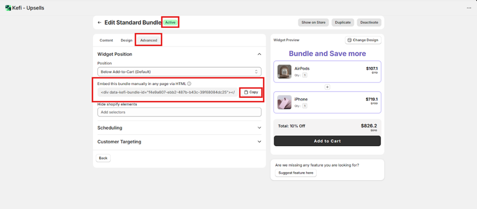 Go to Kefi dashboard, open the Advanced tab of the bundle (Active) you want, and copy the code snippet.